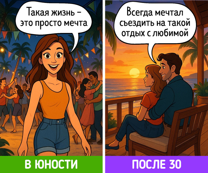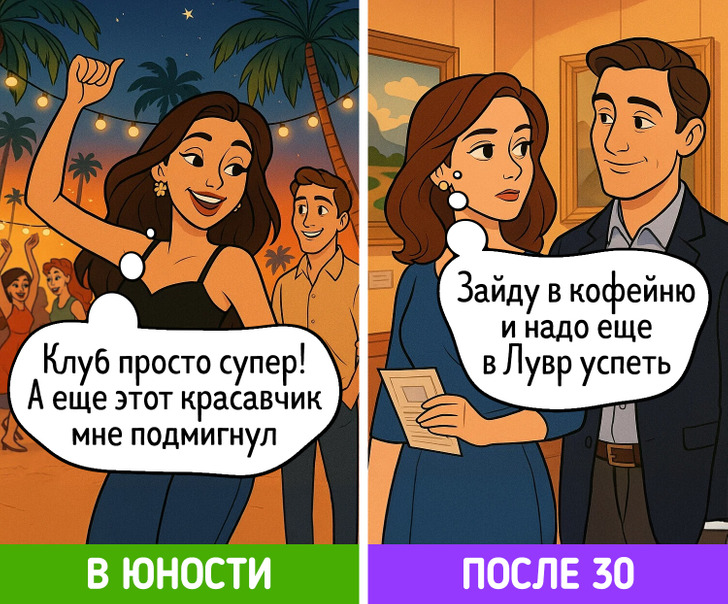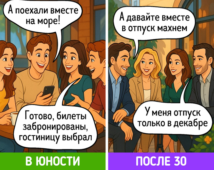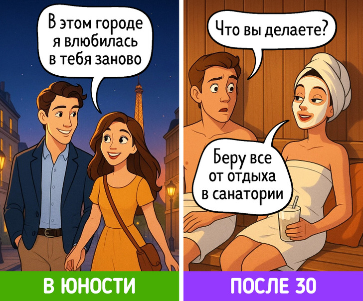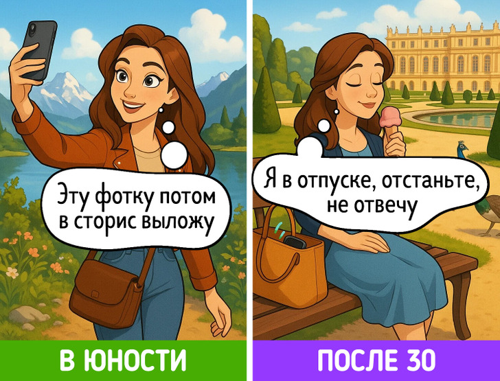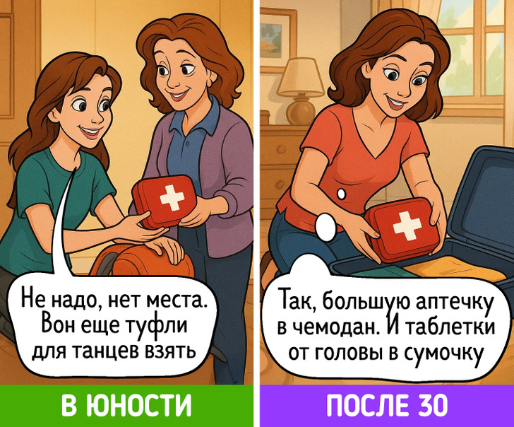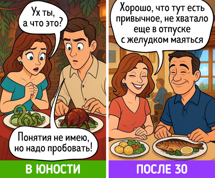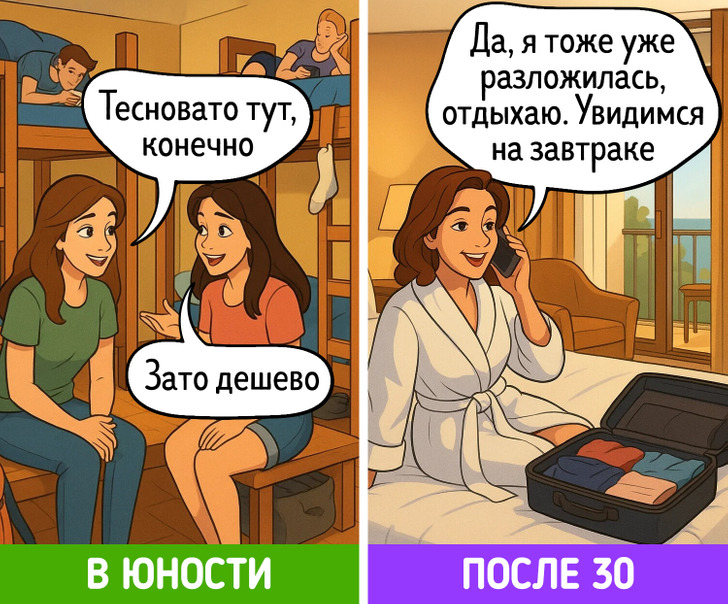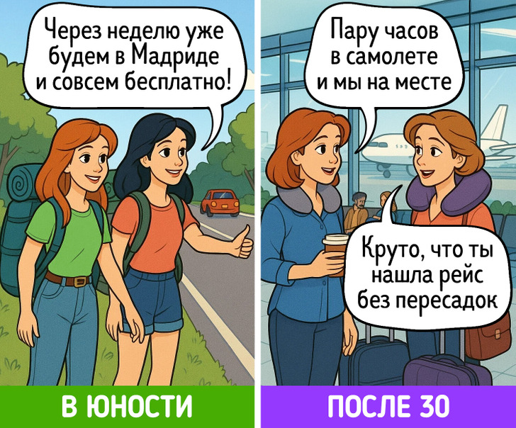 Мы все помним свои первые путешествия: рюкзак за спиной, автостоп, экзотические деликатесы и готовность спать на полу, лишь бы было бесплатно. Тогда хватало одного звонка, чтобы сорваться с друзьями на другой континент. Но вот нам стукнуло 30, и что-то неуловимо пошло не так. На смену «поехали, там разберемся» пришло «посмотрим, какой там UV-индекс», а главное место в чемодане заняла не обувь для танцев, а аптечка. Мы сравнили эти две эпохи — путешествия «до» и «после» тридцати — в забавных комиксах. Готовы узнать, какие из этих ситуаций знакомы вам?