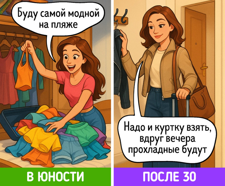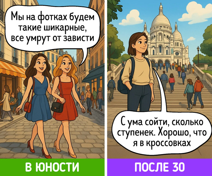 Мы все помним свои первые путешествия: рюкзак за спиной, автостоп, экзотические деликатесы и готовность спать на полу, лишь бы было бесплатно. Тогда хватало одного звонка, чтобы сорваться с друзьями на другой континент. Но вот нам стукнуло 30, и что-то неуловимо пошло не так. На смену «поехали, там разберемся» пришло «посмотрим, какой там UV-индекс», а главное место в чемодане заняла не обувь для танцев, а аптечка. Мы сравнили эти две эпохи — путешествия «до» и «после» тридцати — в забавных комиксах. Готовы узнать, какие из этих ситуаций знакомы вам?