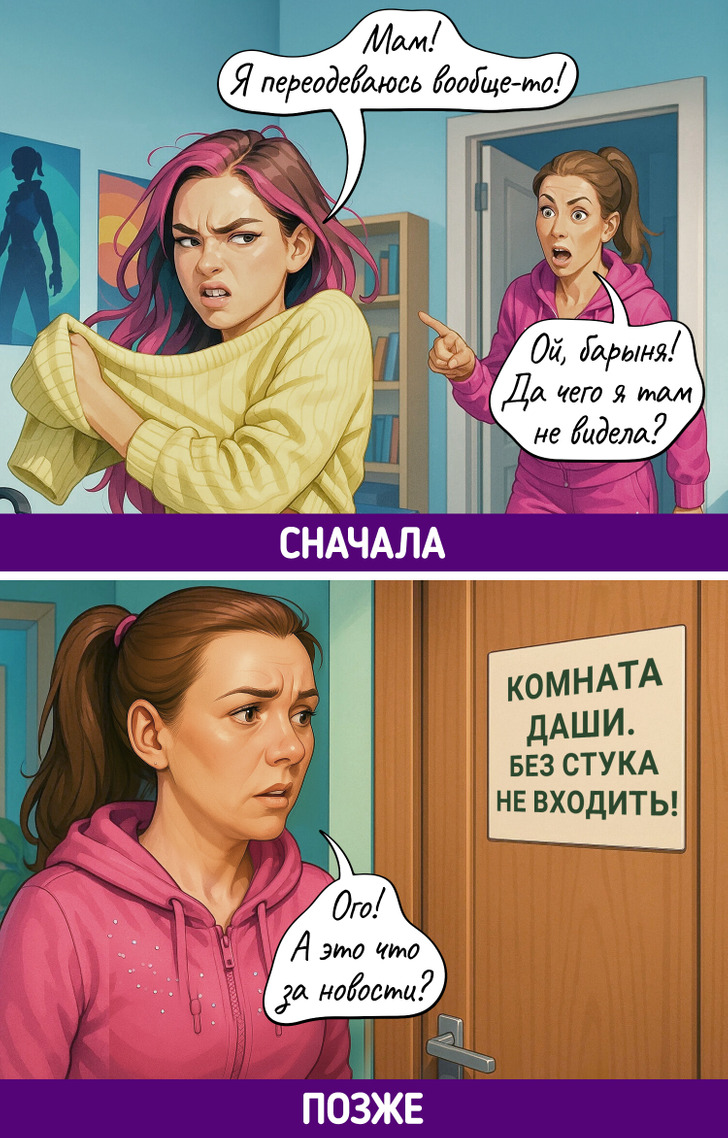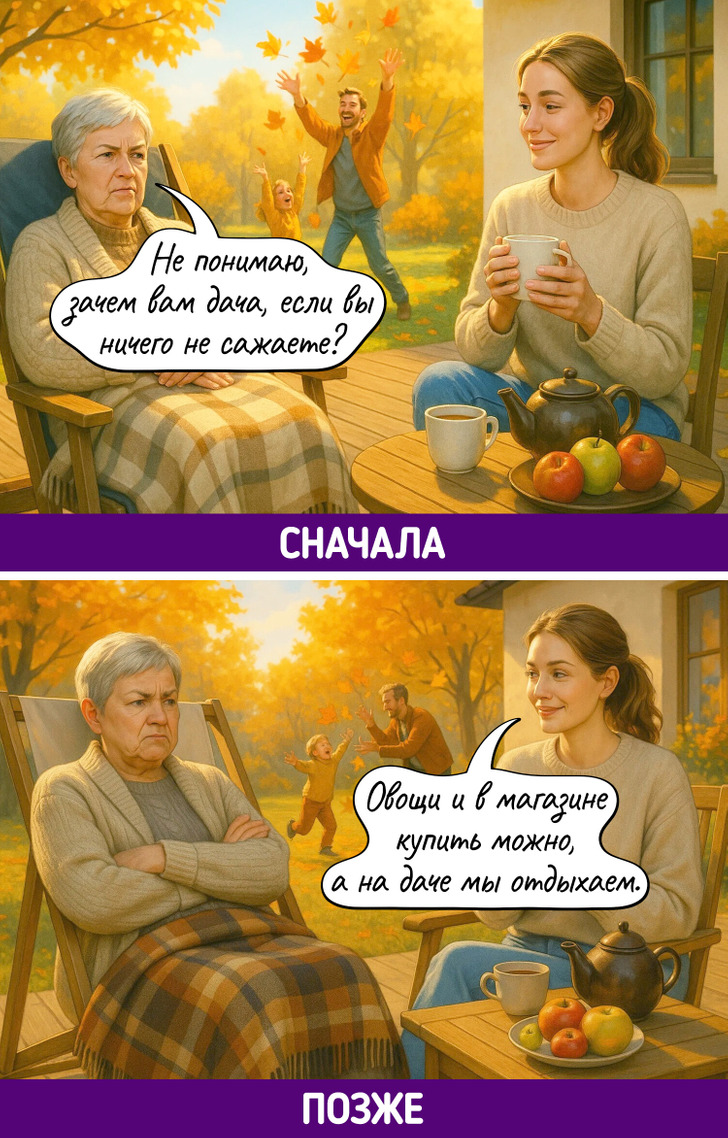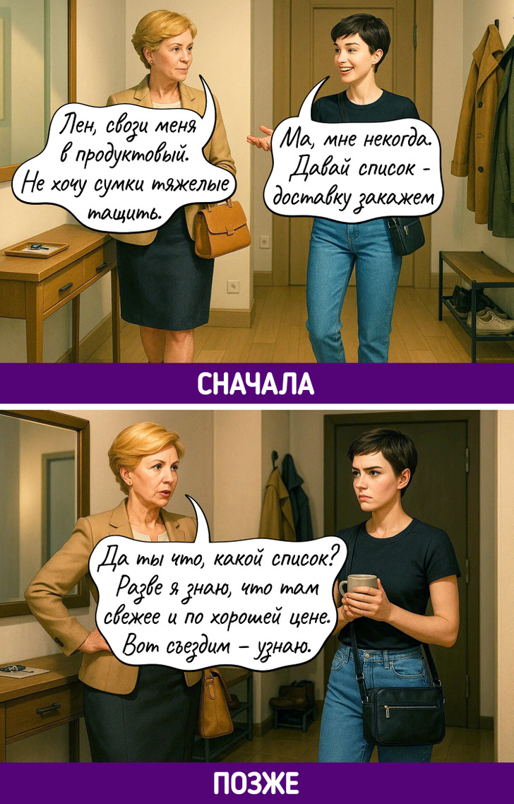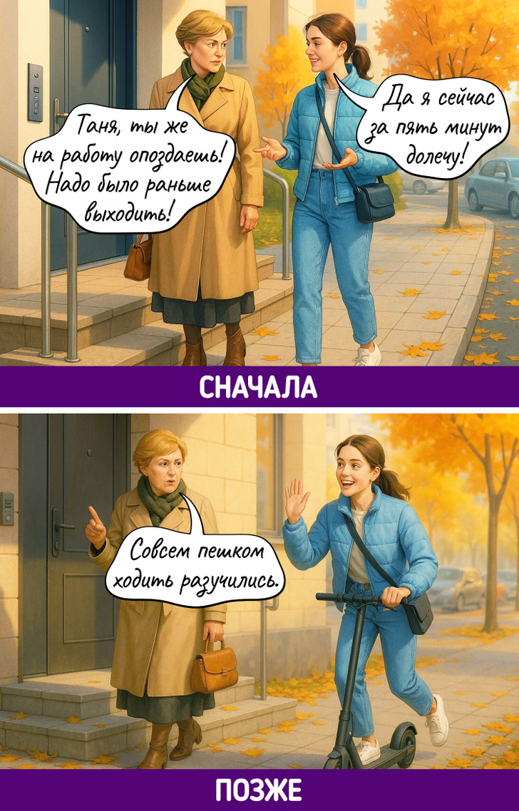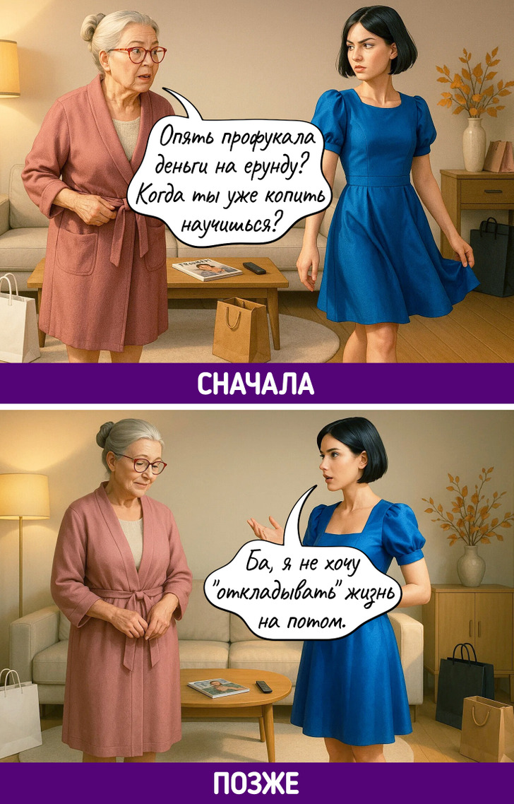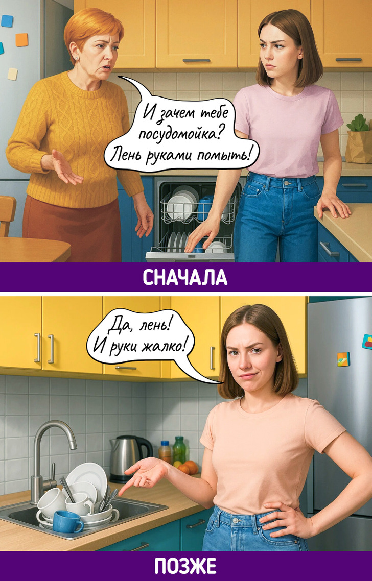 Каждое поколение уверено, что именно его способ жить — правильный. Родители до сих пор не понимают, как можно считать калории, обсуждать проблемы с психологом, а не с подругой, или заказывать клининг. Дети не понимают, зачем терпеть, копить «на черный день» и звонить вместо того, чтобы написать. В итоге — бесконечный диалог, где обе стороны вроде говорят на одном языке, но никак не могут понять друг друга.