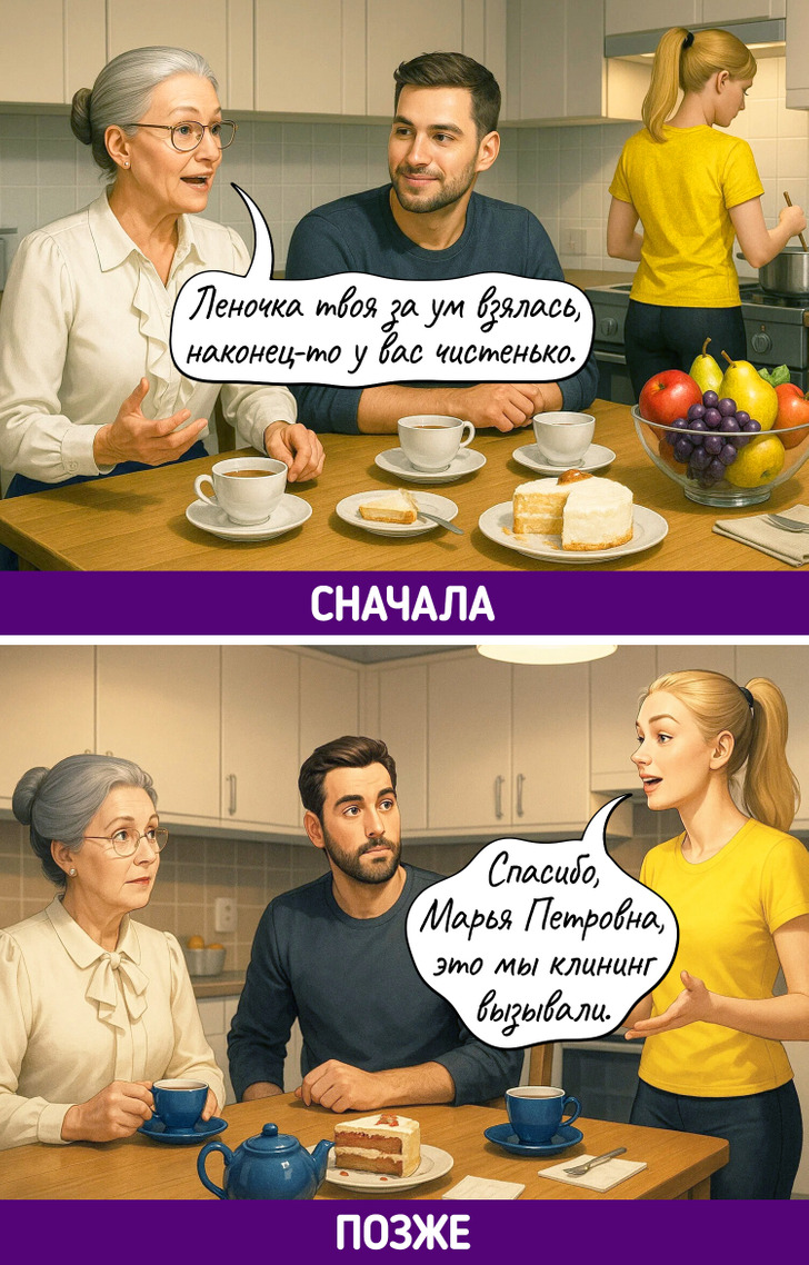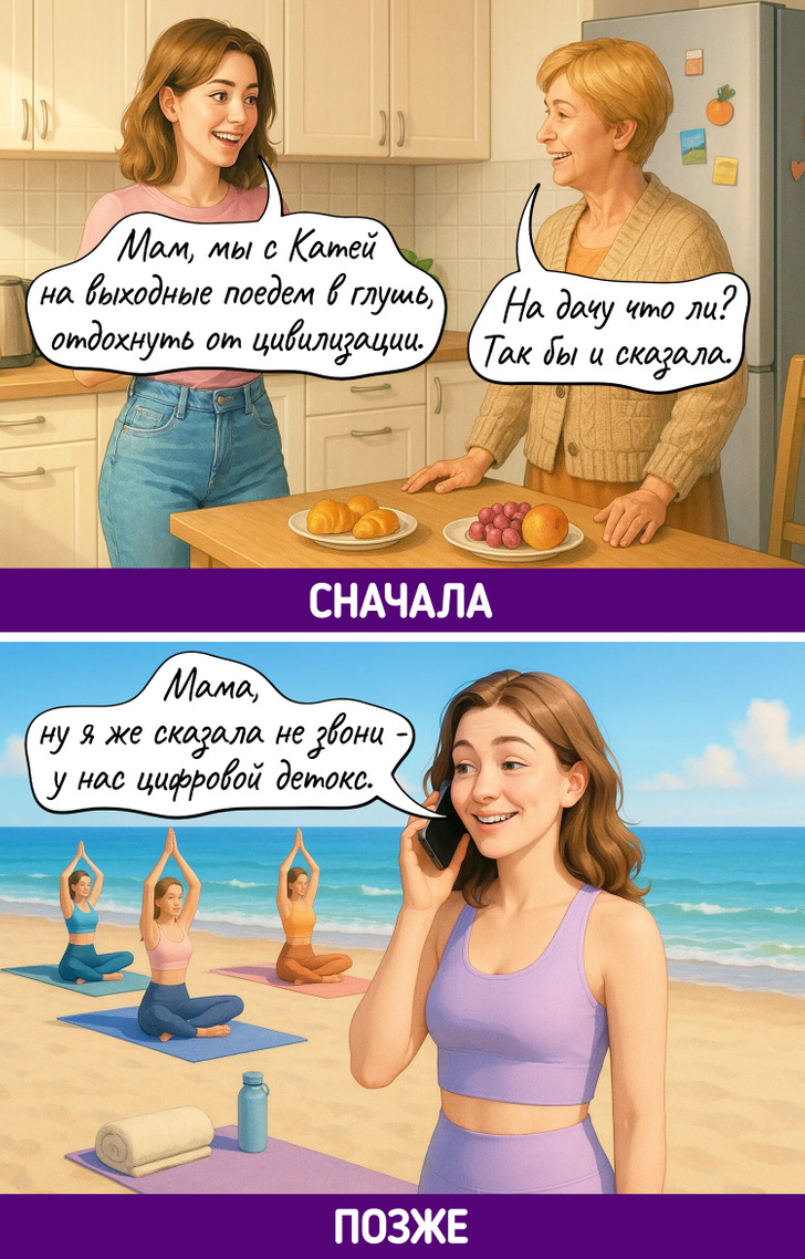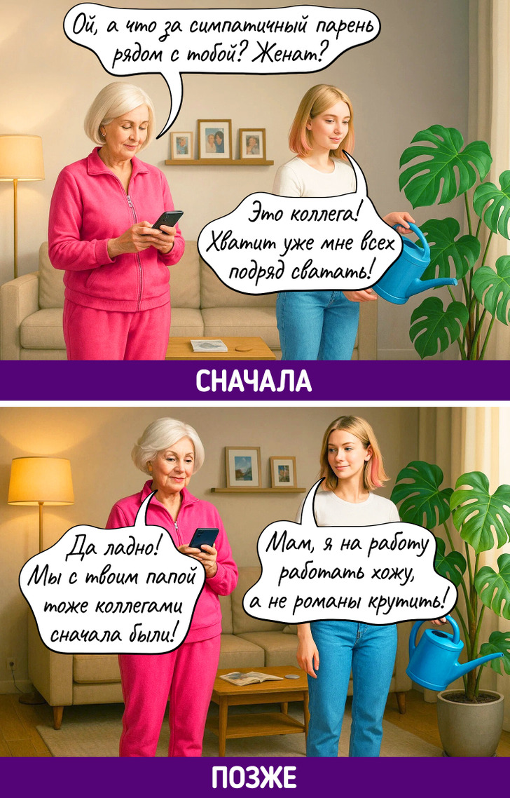 Каждое поколение уверено, что именно его способ жить — правильный. Родители до сих пор не понимают, как можно считать калории, обсуждать проблемы с психологом, а не с подругой, или заказывать клининг. Дети не понимают, зачем терпеть, копить «на черный день» и звонить вместо того, чтобы написать. В итоге — бесконечный диалог, где обе стороны вроде говорят на одном языке, но никак не могут понять друг друга.
