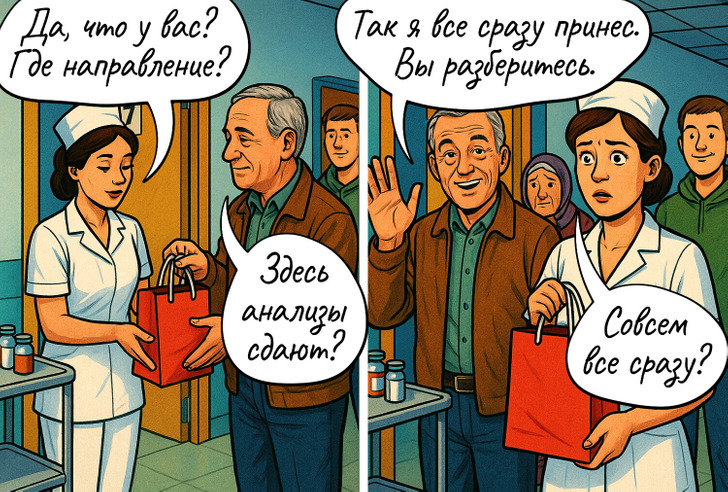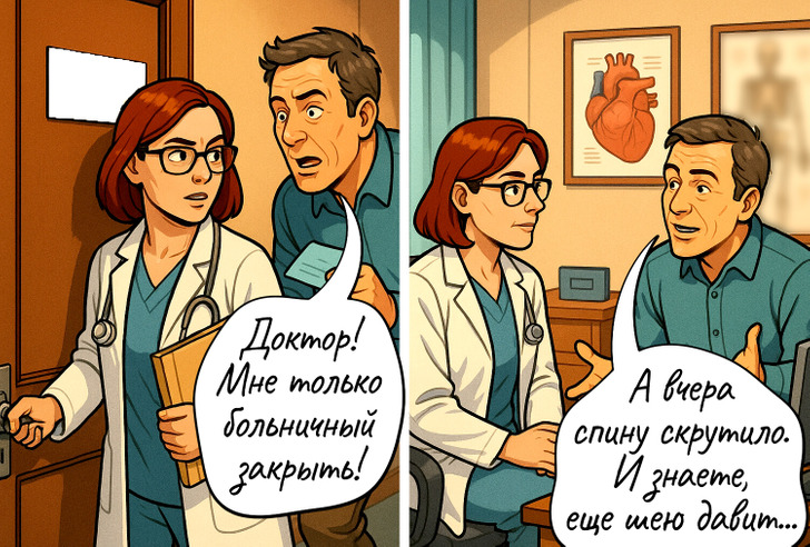 Большинство из нас не любит поликлиники и больницы. Ведь иногда визит к врачу может превратиться в маленький квест. Найти последнего в очереди, заказать талончик за месяц вперед, выпытать у ребенка правду, что у него болит. А ведь врачам тоже как-то приходится справляться с разными проблемами. Мы собрали самые распространенные ситуации в комиксы и внесли в них нотку юмора.