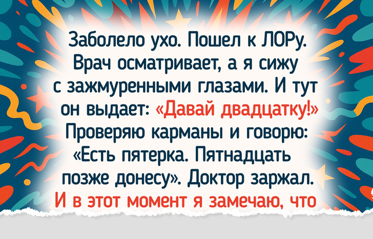 - Заболело ухо. Пошел к ЛОРу. Врач осматривает, а я сижу с зажмуренными глазами. И тут он выдает: «Давай двадцатку!» Проверяю карманы и говорю: «Есть пятерка. Пятнадцать позже донесу». Доктор заржал. И в этот момент я замечаю, что за ширмой стоит медсестра с 20-кубовым шприцем в руках! Ох, как мы смеялись. © neboff / Pikabu