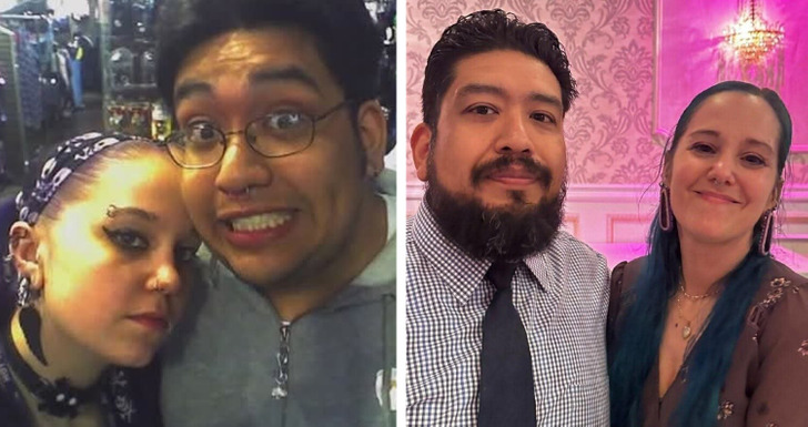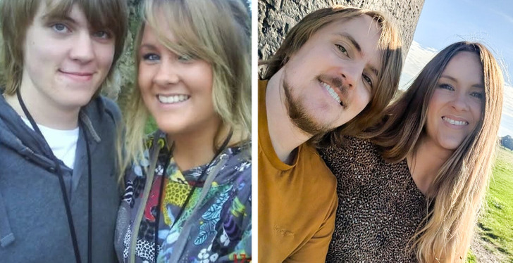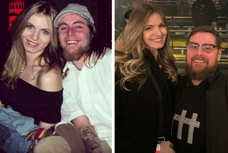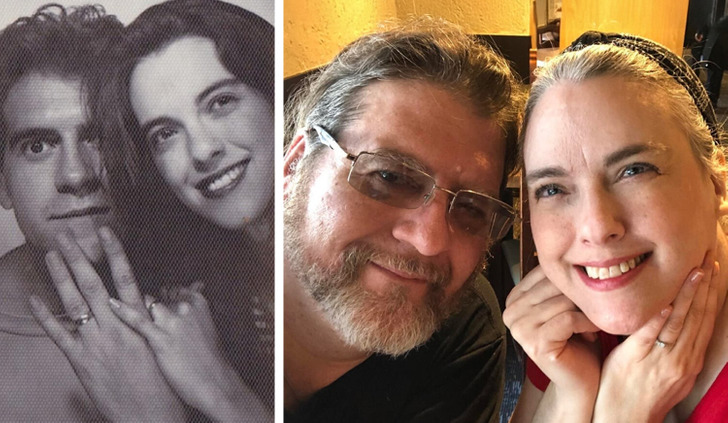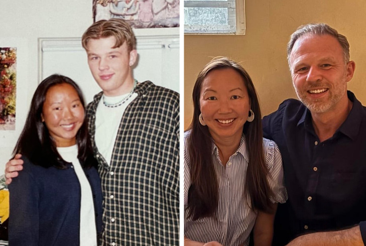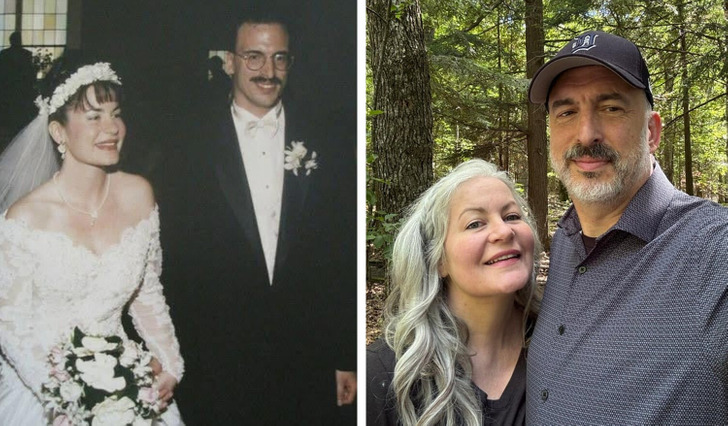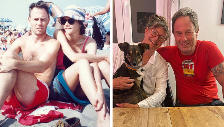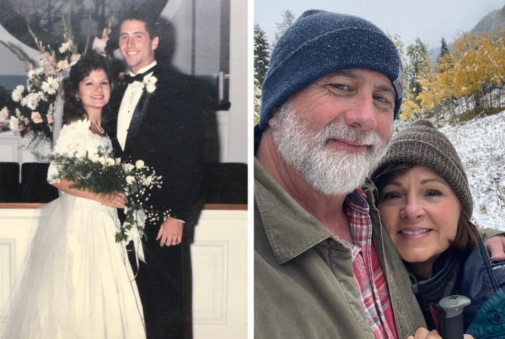 «Из 1987 в 2025. У него по-прежнему есть ямочки на щеках, а у меня все такие же, по выражению нашего внука, „дикие“ волосы»