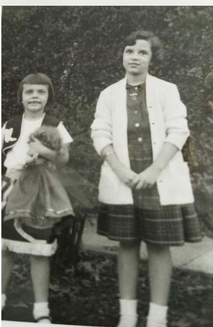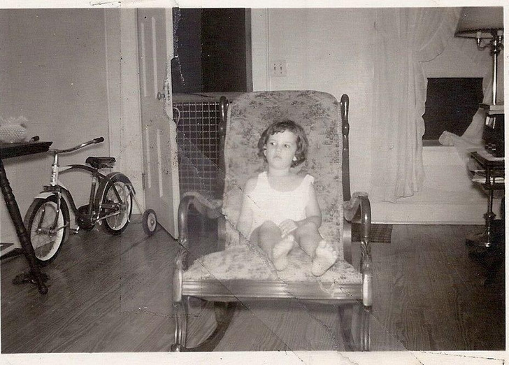 «1951 год. То ли я дулась, то ли о чём-то всерьёз задумалась. А на заднем плане — мой первый велосипед. Я очень долго не решалась снять с него боковые колёсики»