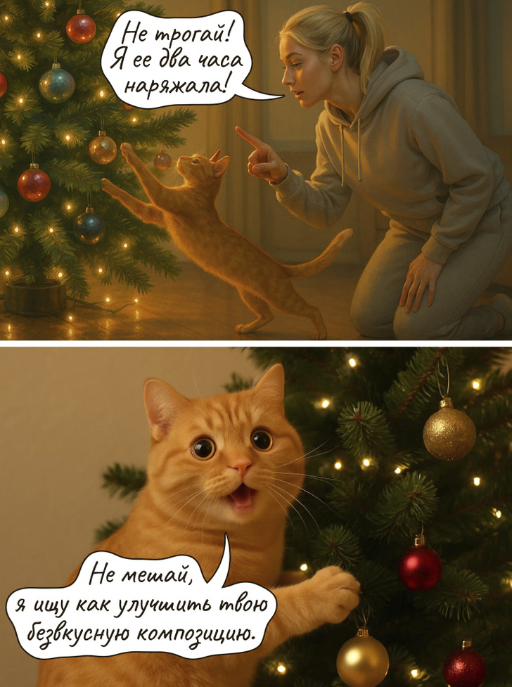 Мне нравится очень восторг этого котика из сети) сайт правда, жмёт качество. Хозяйка повесила гирлянду, а котик в шоке))