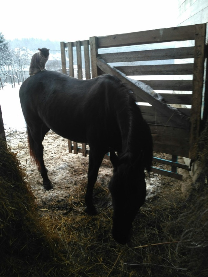 «У нас на конюшне живет кот. Очень дружит со всеми: с конем, козами, кроликом и собакой. Прошелся по снегу — греет лапки»