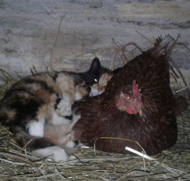 «Мой кот, который оказался кошкой, родила пятерых котят. Пришли греться к курице»