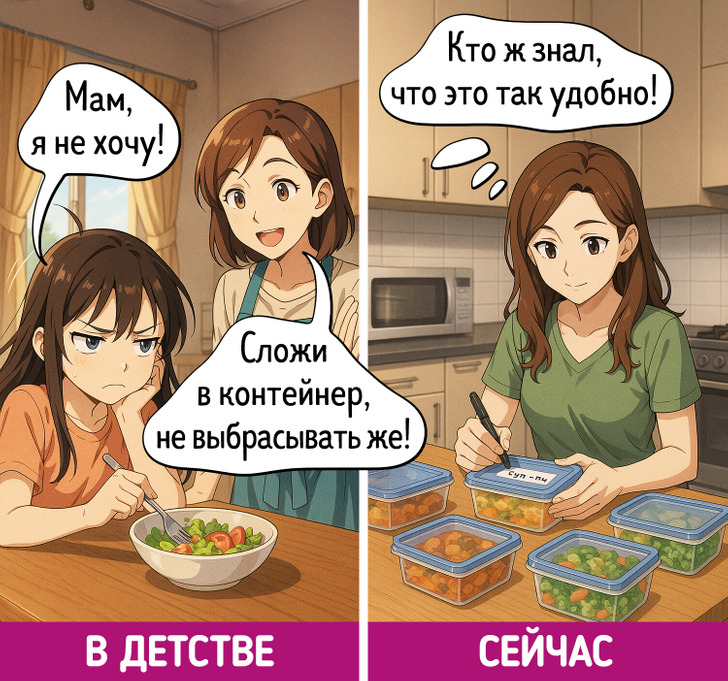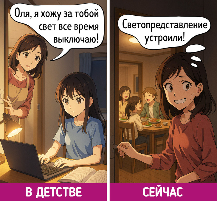 Есть фразы, которые мы обещали никогда не произносить. Есть вещи, которые мы божились никогда не делать. А потом нам внезапно стукнуло 30. И вот мы уже сами ходим по квартире, выключая свет в пустых комнатах, храним красивые банки из-под варенья и искренне считаем, что лучшая одежда — это та, в которой не дует. Я нарисовала 15 комиксов о том, как незаметно мы превратились в своих маму и папу. Спойлер: кажется, они все это время были правы.