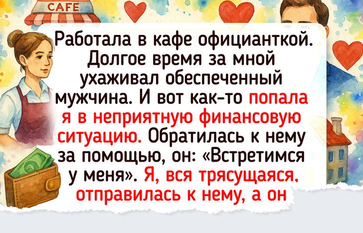 - Работала в кафе официанткой. Долгое время за мной ухаживал обеспеченный мужчина. И вот как-то попала я в неприятную финансовую ситуацию. Обратилась к нему за помощью, он: «Встретимся у меня». Я, вся трясущаяся, отправилась к нему, а он встретил у порога, улыбнулся, поцеловал в щеку и молча сунул конверт с деньгами, захлопнув дверь. © Подслушано / Ideer