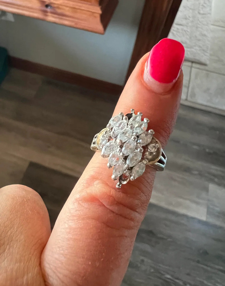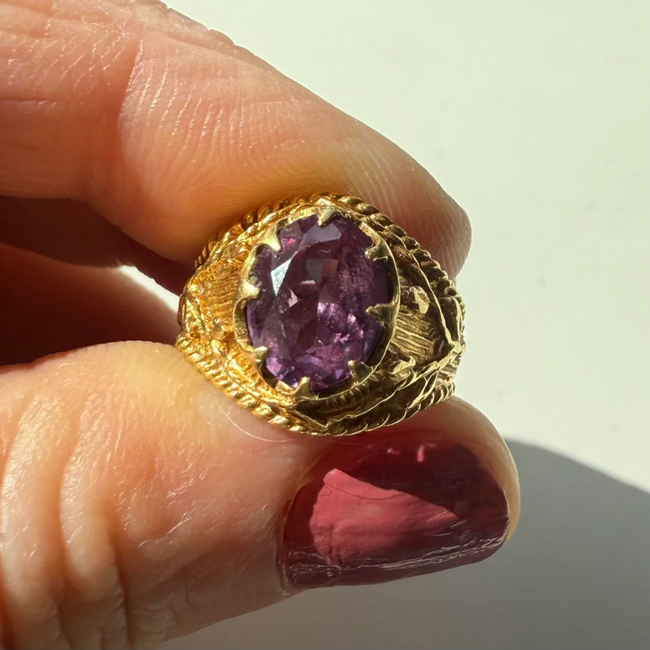 На выходных ходила по секонд-хендам и нашла это кольцо в кармане сумки, которую купила. На нем стоит проба «18к». Похоже, это желтое золото с аметистом — возможно, ручная работа.