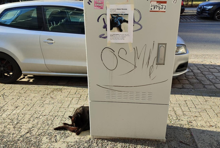 Пропавшая кошка сидит прямо рядом с плакатом о ее пропаже
