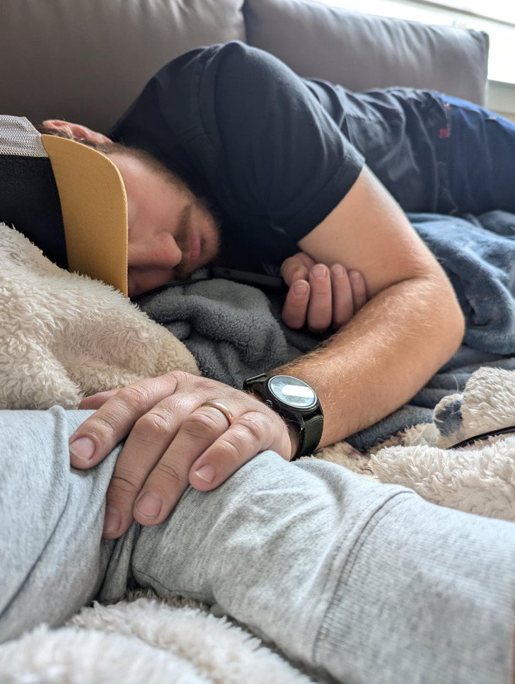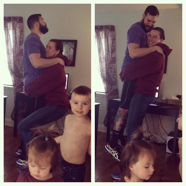 «Мой муж обожает обниматься. Он вернулся из командировки, когда я еще работала, и решил вздремнуть вот так»