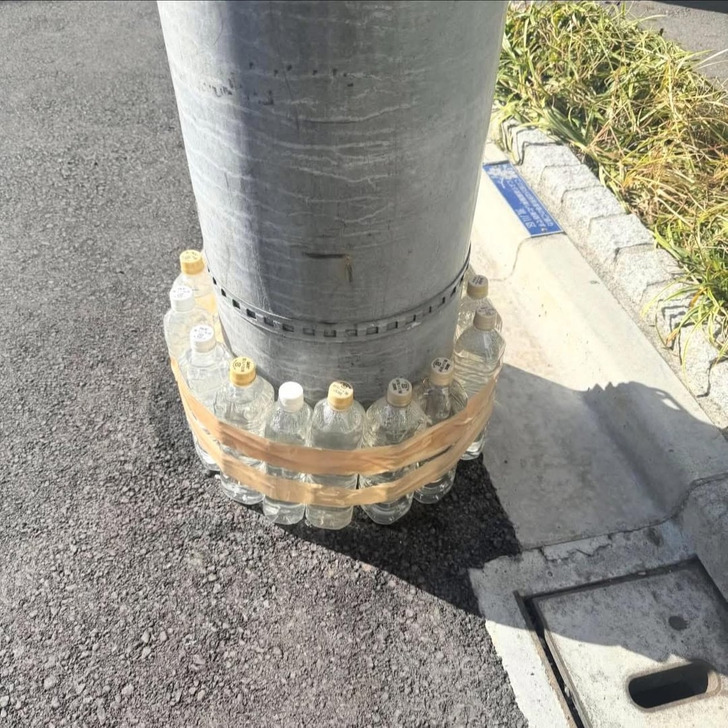 Нокоёкэ (Кошко- отпугиватель) называется. Типа блики, отражающиеся от воды, мешают животным приближаться и делать свои делишки. Ну, котики делают это сидя и на земле, чтобы потом закопать свои "пипи-каки". Столбы же стоят все же на асфальт.покрытии. Собаки поднимают лапы, отмечая свою территорию, независимо от накрученных бутылок.