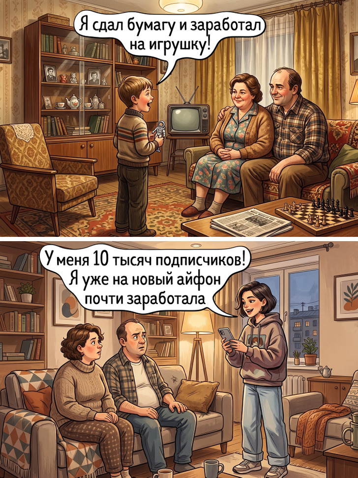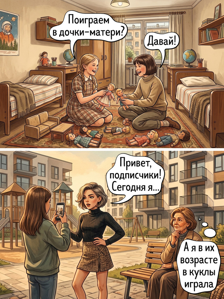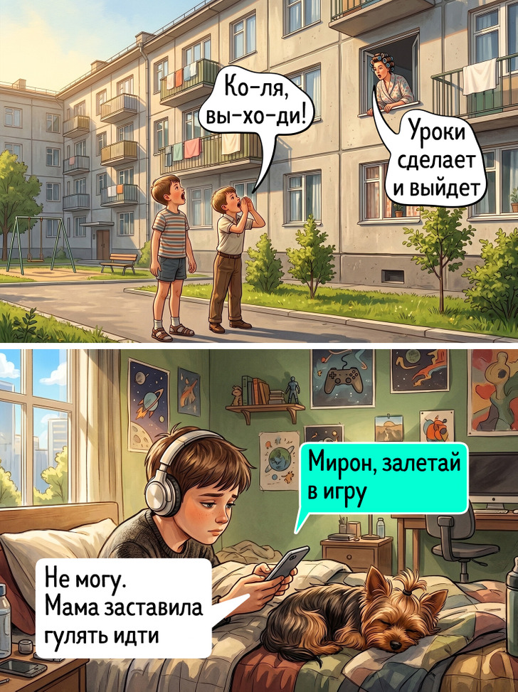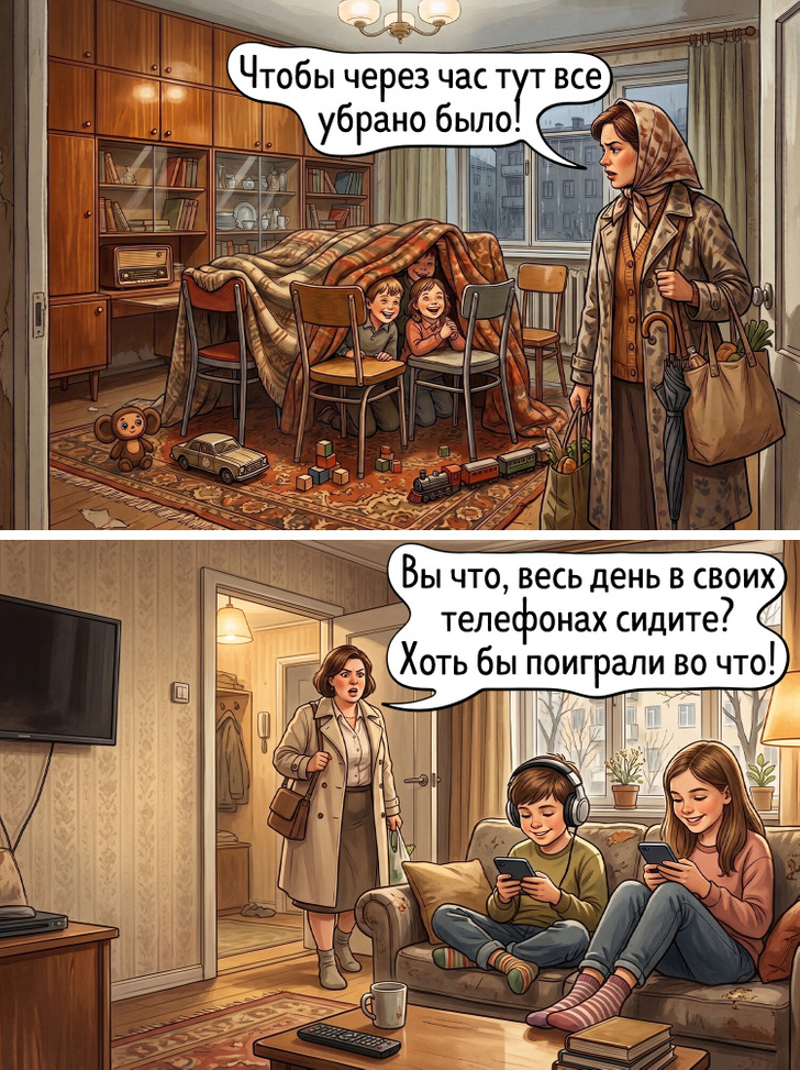 Пусть современные дети не собирают макулатуру и не знают, как крутить диск домашнего телефона, зато они в хорошем смысле прилипчивые, умные и умеют делать огромное количество вещей, в которых мы, взрослые, разбираемся со скрипом. Да и в конце концов, неважно, строили вы форт из одеял или покоряли виртуальные миры — главное, чтобы в жизни каждого ребенка было место для поддержки и любви.