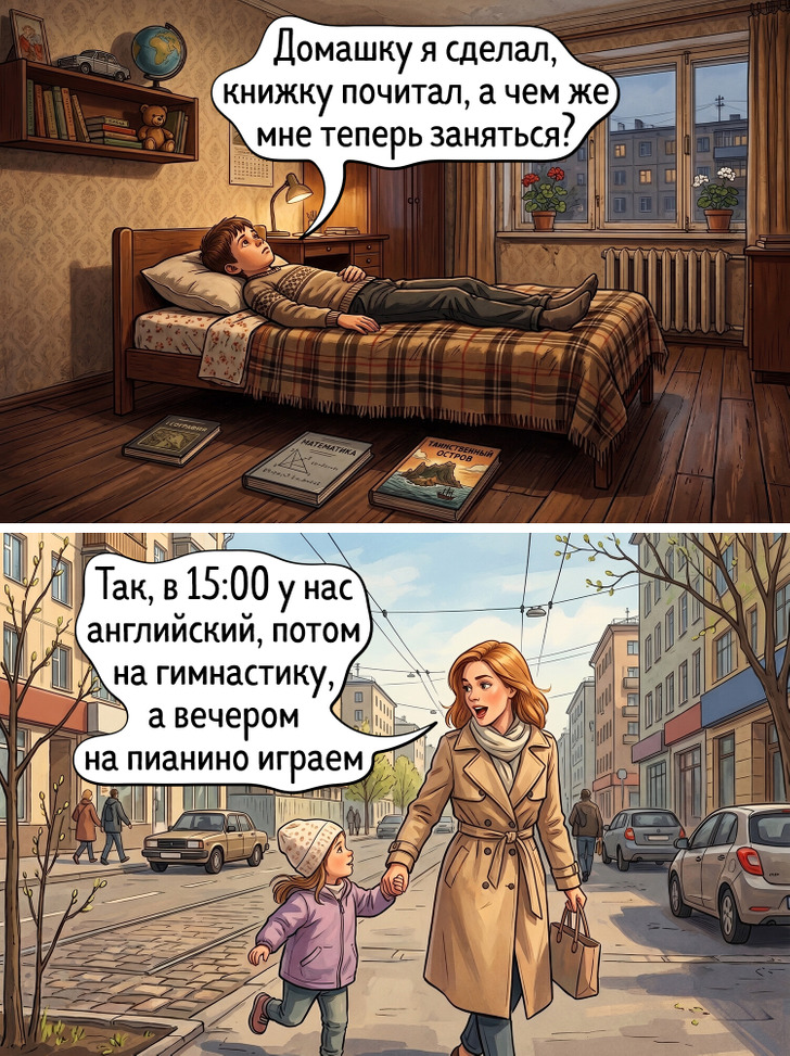 В нашем детстве далеко не каждый ребенок ходил на какой-либо кружок. Большую часть времени мы были предоставлены сами себе. Сегодняшние дети занятее взрослых!
