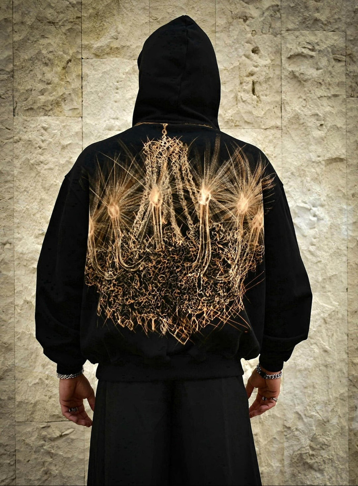 "Кататься на люстре" - идиома, обозначающая дикую вечеринку, когда люди сходят с ума и отрываются вовсю. В песне Сии, кстати, именно об этом поется. А работа просто потрясающая, так передать блеск хрусталя и свечей, высокое мастерство.