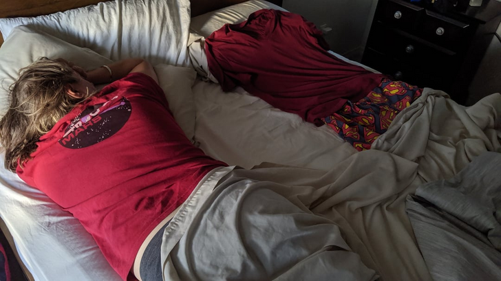 - Муж однажды подрывается, смотрит на меня бешеными глазами и выдает очень грозно: «Какие-то проблемы?!» — и ложится дальше. Но теперь это семейный прикол.