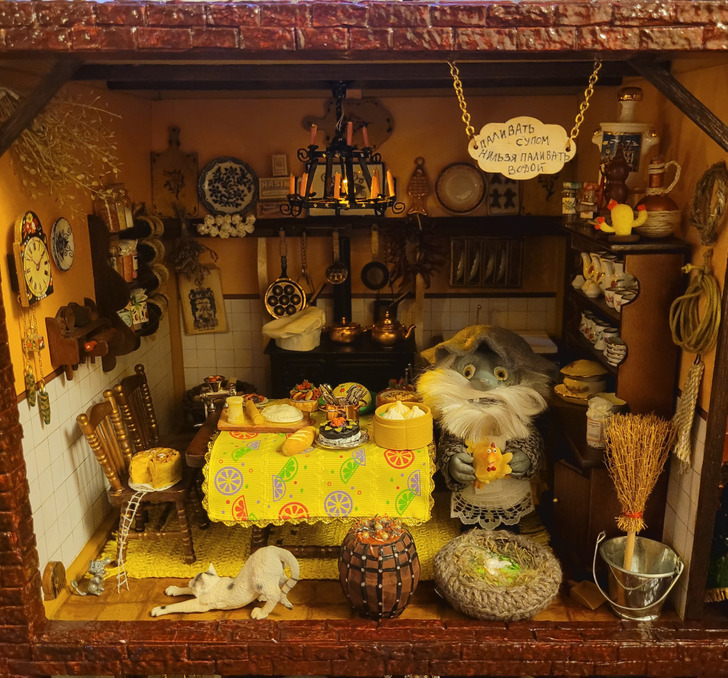 Потрясающая работа! Столько деталей, мелочей... У человека много идей, а площадь "проекта" маленькая. Может, немного перенасыщенно... Но все равно, выглядит очень красиво и натурально: стульчики, полочки, часы, ведро с веником... Чудо какое!