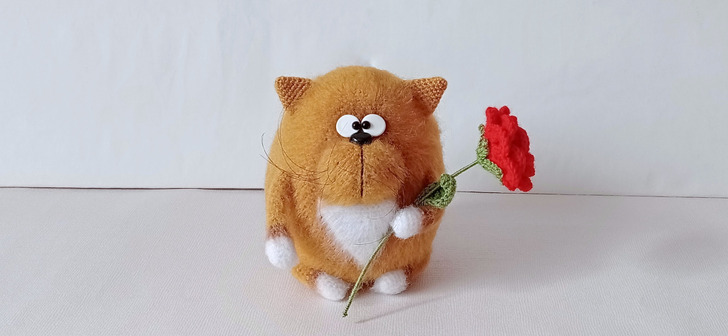 «Игрушка связана крючком, в лапах и хвосте проволока. Зверь невысокий, всего 15 см, но упитанный, обхват „талии“ 33 см».