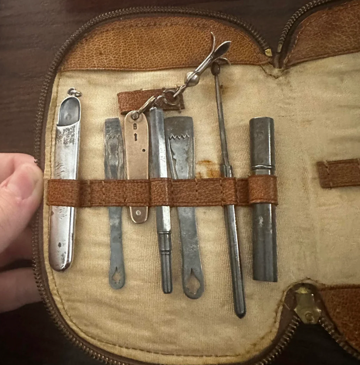 «Досталось в наследство бабулино добро, но не могу понять, зачем это все нужно» Набор с разными полезными предметами — например, крючком для застегивания пуговиц. Также там есть инструмент для очистки или расширения отверстия, и все такое. © lawnoptions / Reddit