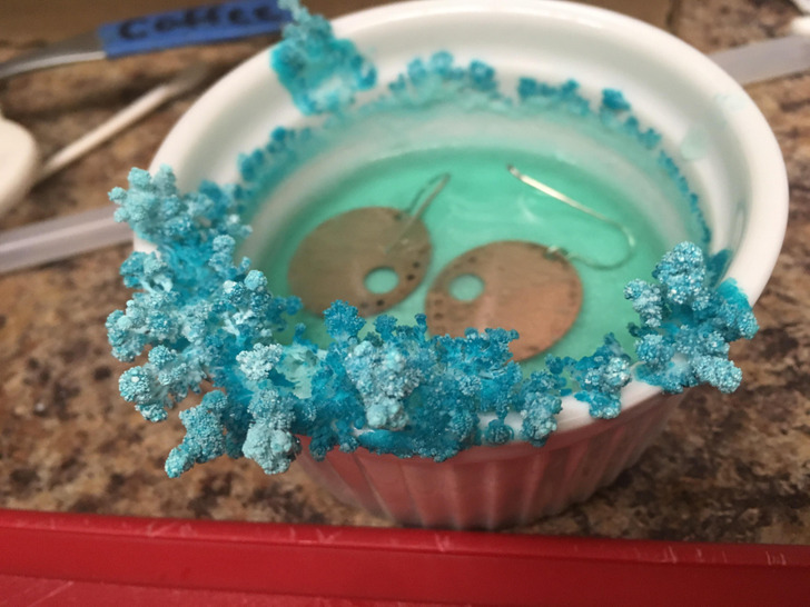 «Решила почистить медные сережки и замочила их в уксусе. Вот что я обнаружила, когда вернулась к ним. Наверное, все дело в том, что я добавила и соль»