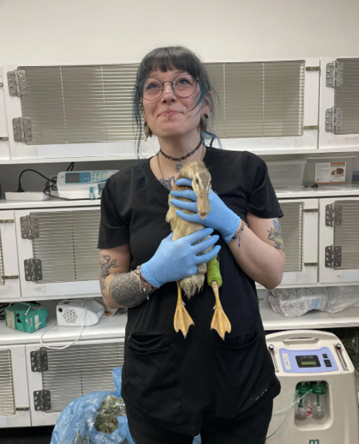 «Недавно устроилась на работу в ветеринарную клинику, которая лечит „экзотических животных“ — и впервые смогла подержать в руках утку. Думаю, выражение моего лица говорит само за себя!»