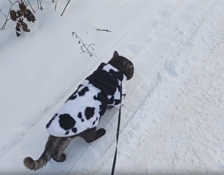 - Он любит гулять на улице на шлейке. Это происходит обычно весной, осенью и летом. Но в этом году были морозы и насыпало много снега. А он снег видел только в окно. И вот сегодня был чудесный денек, светило солнышко, ветра не было, температура до плюс четырех, и я решила его вывести на прогулку. Мы надели новую шубку и пошли во двор. Я думала, что кот полезет проверять сугробы, но он ходил только дорожкам — культурный. © feya.dolls / Pikabu