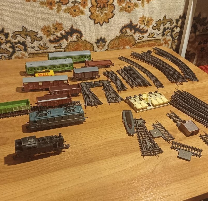 «Нашел игрушку из моего далекого детства. К сожалению, много чего повреждено, но рельсы целые, а локомотивы и вагончики на ходу»