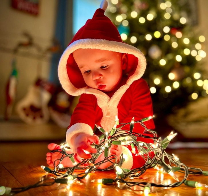«Мой 6-месячный малыш обожает все, что светится, поэтому мы устроили небольшую фотосессию, на которой он впервые поигрался с новогодними гирляндами!»