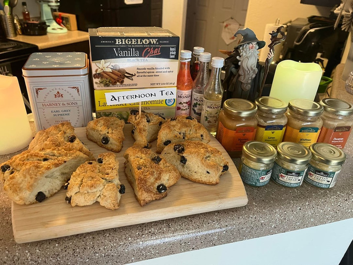 «Завтрак — яйца, бекон, помидоры, картофельные оладьи. Второй завтрак — вафли с ягодами и маслом с корицей. Перекус — капрезе, хлеб лембас. Обед — мясо, сыр, еще хлеб лембас. Послеобеденный чай — чай, булочки с черникой, сливки и мед. Первый ужин — суп из крем-сыра с картофелем. Второй ужин — стейк с розмарином, картофель и морковный пирог».