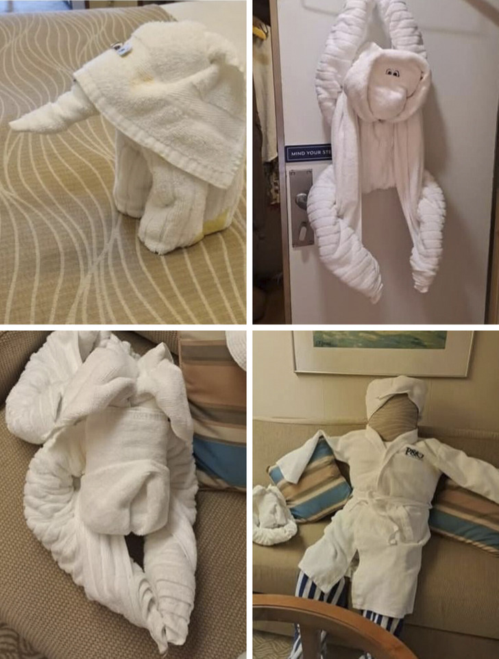 «Горничные оставили нам слона из полотенец. Я ответила обезьянкой из полотенец. Они сделали нам в ответ щенка, тогда я соорудила для них парня»