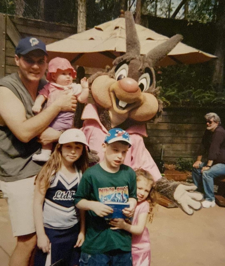 «Только спустя 18 лет после отдыха в Диснейленде мы, глядя на это фото, поняли его изюминку. Справа позади нас сидит Джордж Лукас»