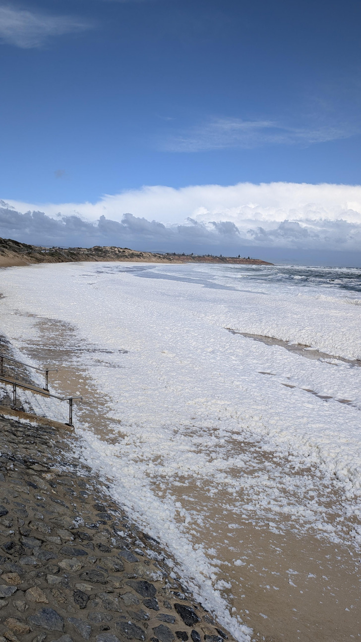 Пена от морских водорослей полностью покрыла пляж и берег выглядит будто его кто-то «посолил»