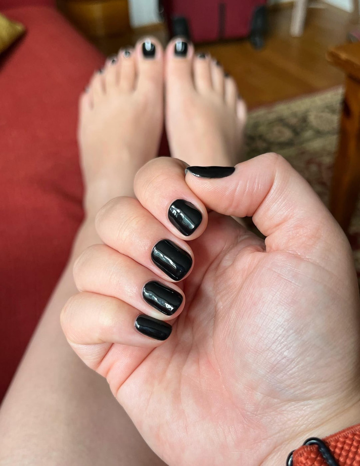 «Я уезжаю в командировку на 2 недели. Работаю биологом. Поэтому руки часто бывают грязными, под ногтями забивается грязь. Нашла решение: черный маникюр»