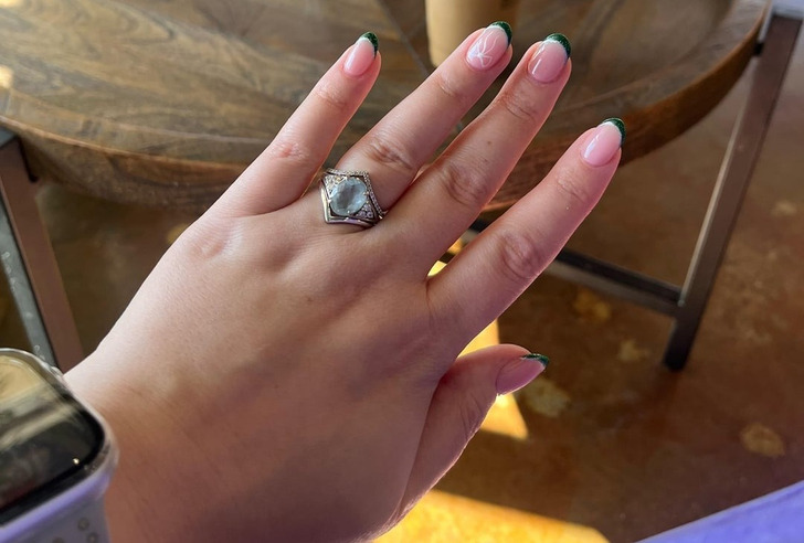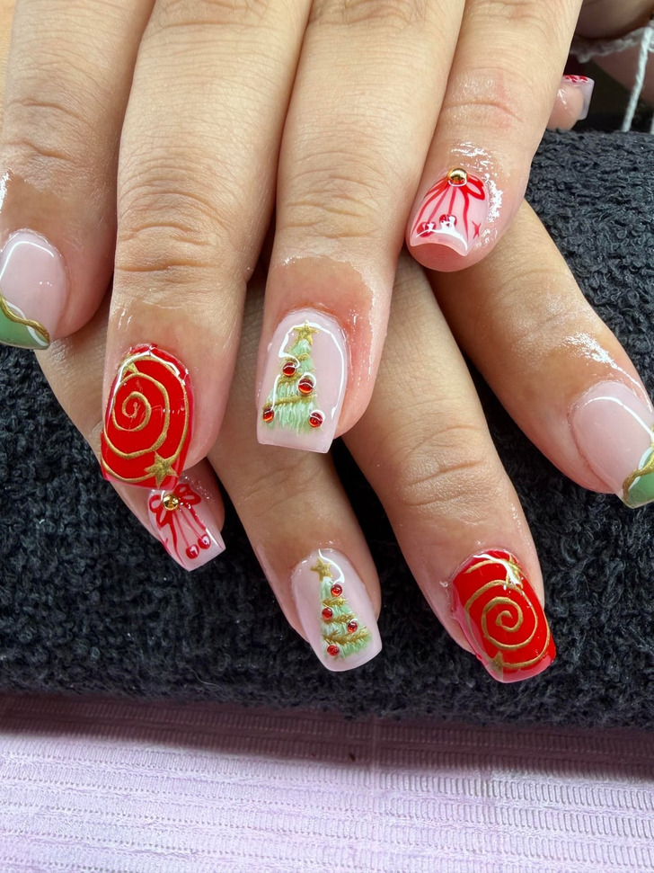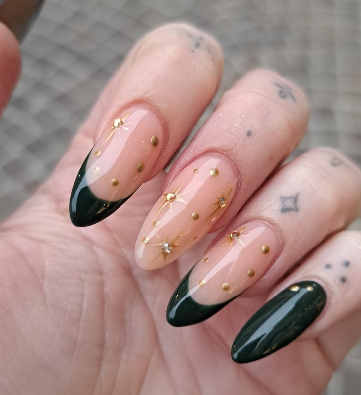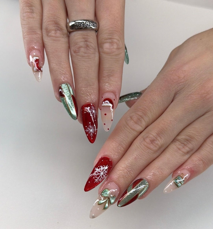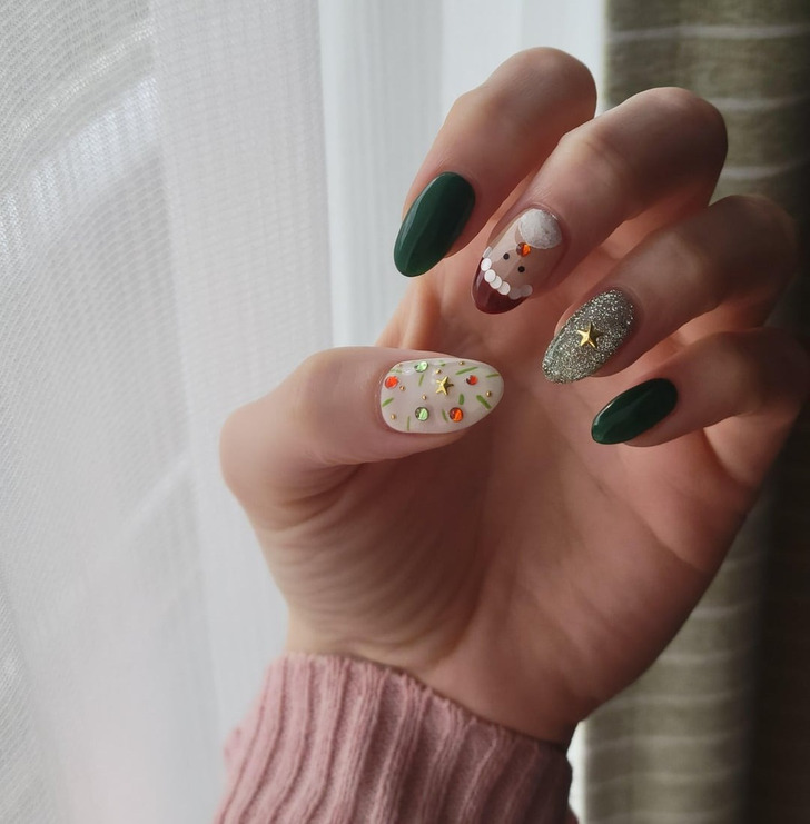 елочки на акцентных ногтях или более яркие решения. Нейл-мастер Ирам Шелтон предлагает покрасить остальные ногти в зеленый цвет, но если вы хотите добиться более изысканного вида, можете просто сделать полупрозрачное покрытие вместо этого. Этот дизайн предоставляет большую свободу для фантазии!