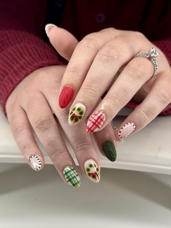 С наступлением холодов ничто не дарит столько тепла и уюта, как любимый вязаный свитер. Такие свитера нашли свое воплощение и в маникюре. Принт, навеянный вязкой и узорами свитера— это объемный дизайн, который идеально передает атмосферу зимних дней, горячего шоколада и праздничного комфорта. Главная фишка заключается в текстуре. Обычно мастера используют густой гель или гель-краску, чтобы создать выступающие косы, ромбы или жгуты. Дизайн смотрится наиболее реалистично и «уютно» при использовании матового покрытия, так как оно имитирует шерсть или мягкую пряжу. Цвета стоит выбирать приглушенные: бежевый, молочный или бордовый, темно-синий, оливковый. Можно добавить нейтральную клеточку.