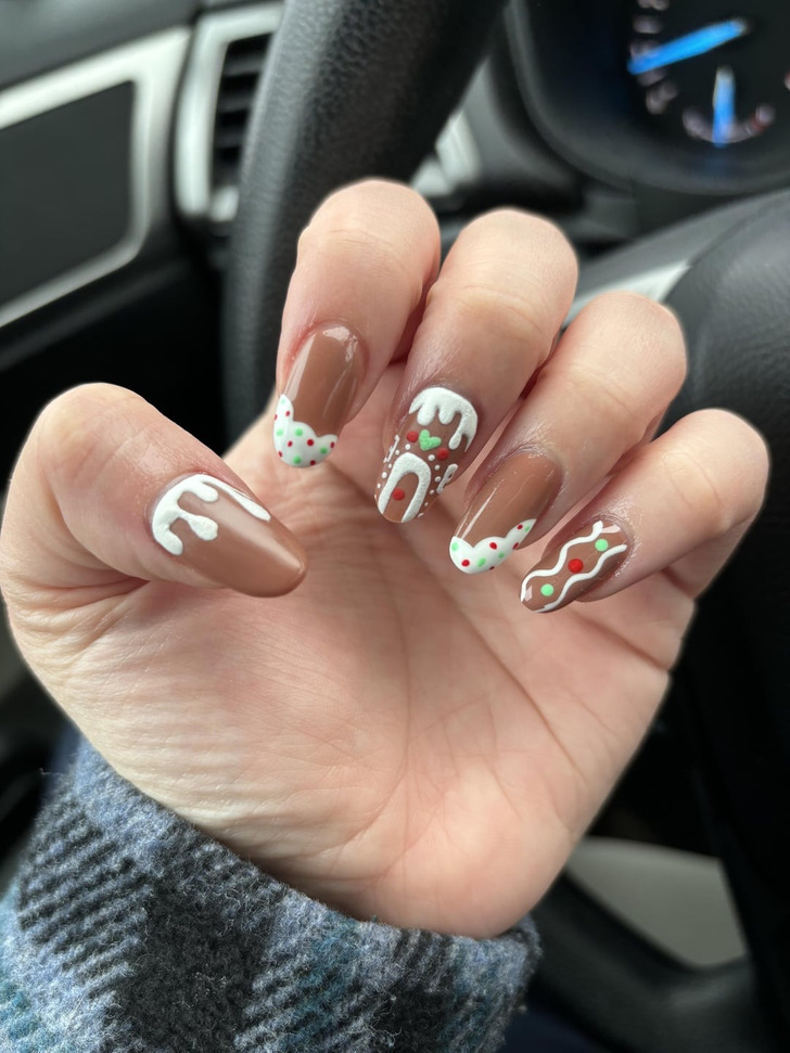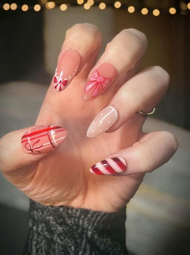 Если для вас Новый год — это прежде всего волшебство, мультики и ощущение детского восторга, то вам точно понравится тренд на милые праздничные дизайны. Акцентными деталями могут стать любимые герои, бантики, пряники, сладости, зверята или подарки. Можно придумать для каждого ногтя свой дизайн. Не переживайте, все будет смотреться более чем сбалансированно, стоит только выделить несколько цветов и придерживаться их во всех дизайнах.