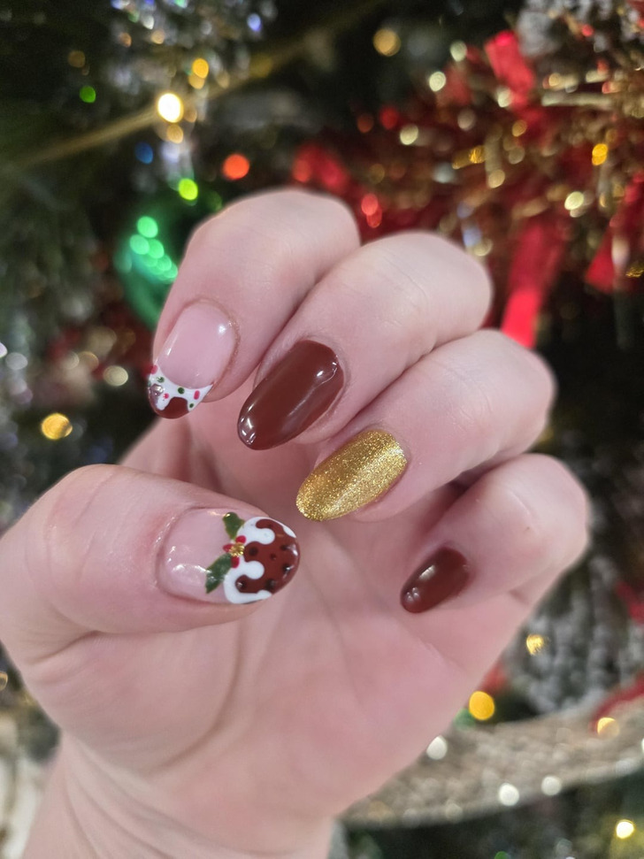 Золото детали — самый универсальный способ добавить торжественности вашему образу, не перегружая его. Такой маникюр будет уместен на любом зимнем торжестве. Золото прекрасно сочетается как с приглушенными, так и с яркими базовыми цветами. Сочетайте его с новогодней палитрой или более приглушенными оттенками. Поталь, золотая втирка, глиттер — используйте все, что душе угодно.