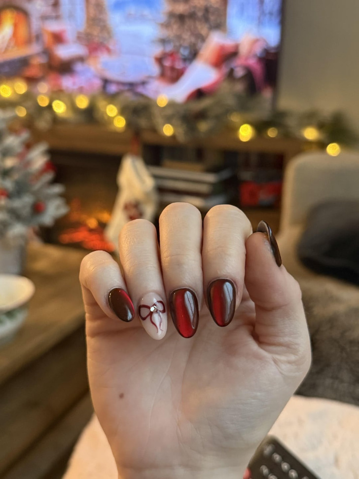 Мы уже сказали о том, что елочки хорошо смотрятся на ногтях, но не стоит забывать про елочные игрушки. Любители маникюра, налетайте на этот тренд и выбирайте свой принт, форму и покрытие! Бархатную поверхность шаров отлично передаст маникюр «кошачий глаз»: а блеска мишуры можно добиться с помощью хромового покрытия или глиттера. Будто разные игрушки на елке, каждый ноготь может отличаться дизайном. Главное — использовать одну и ту же цветовую палитру, чтобы все смотрелось гармонично.