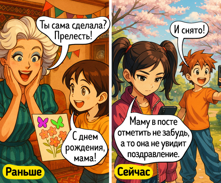 Сейчас вместо самодельной открытки скорее можно получить видеопоздравление в соцсетях. На холодильник не повесишь, но все равно приятно