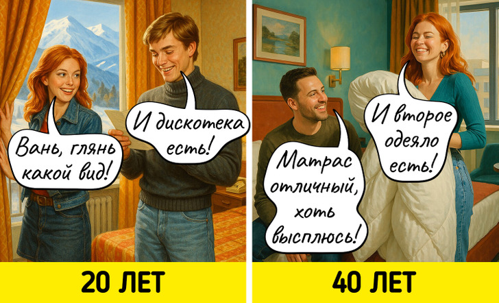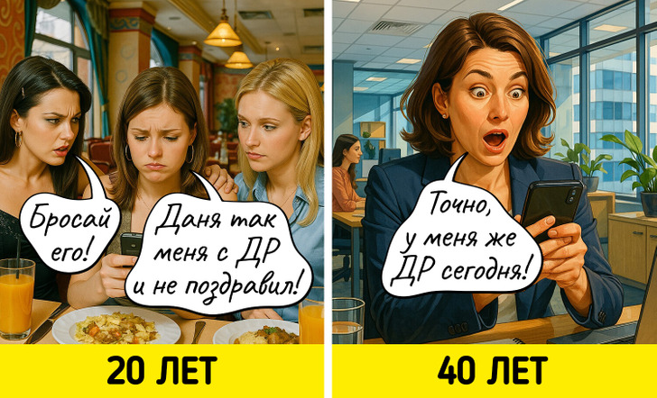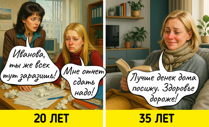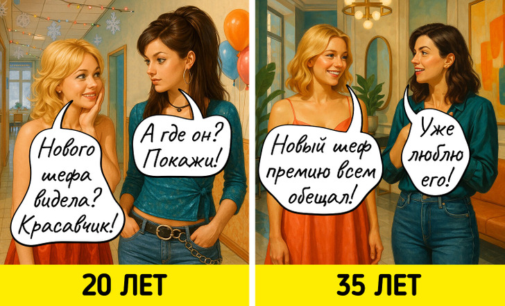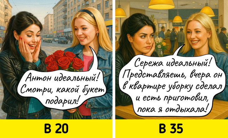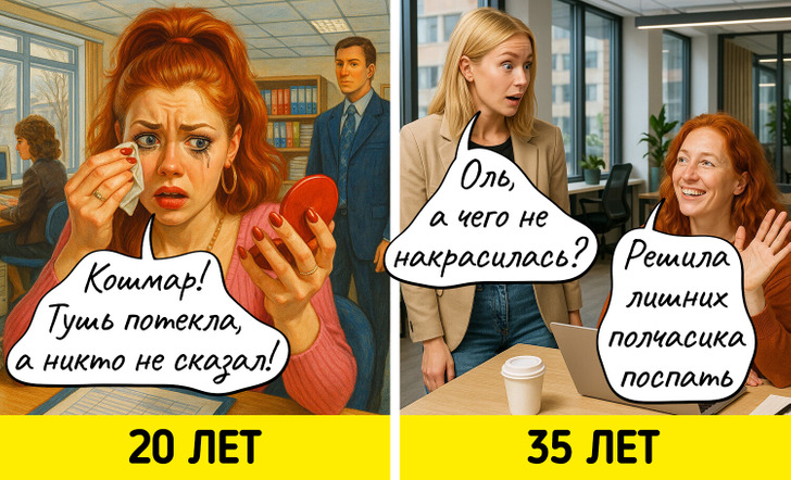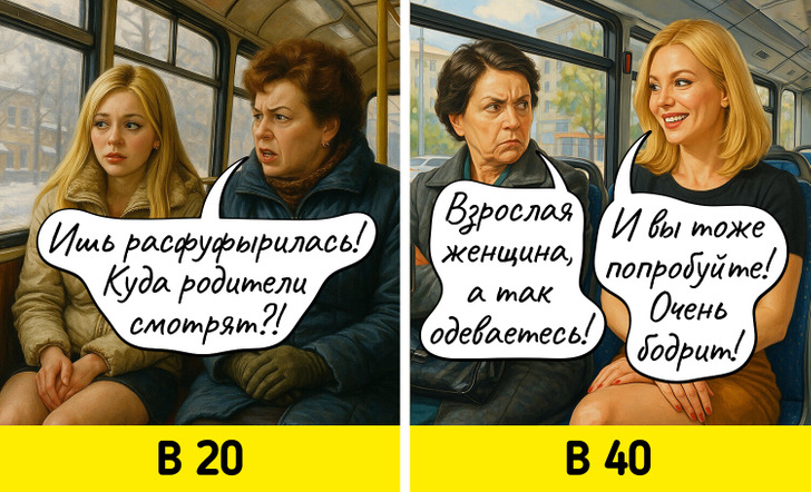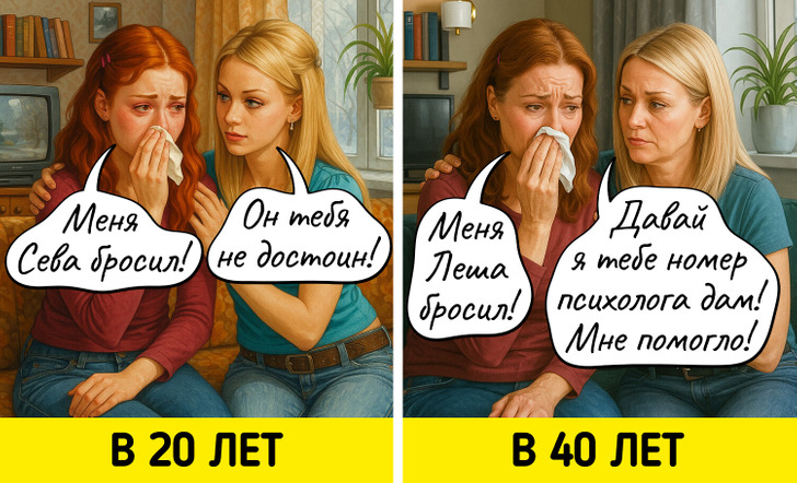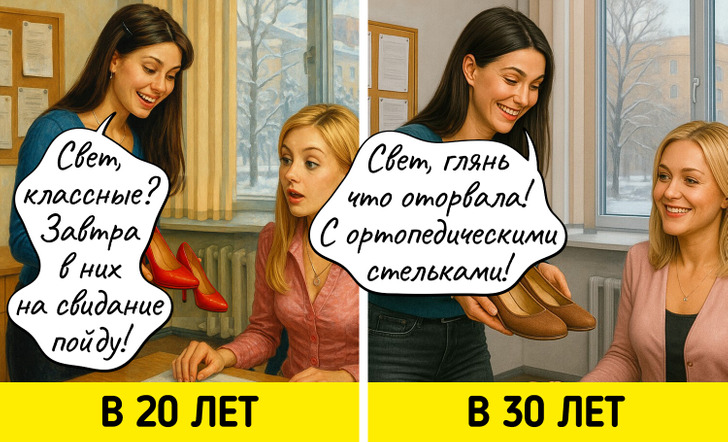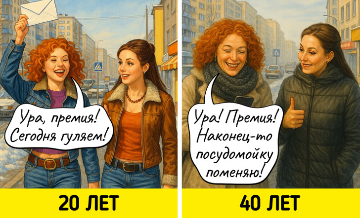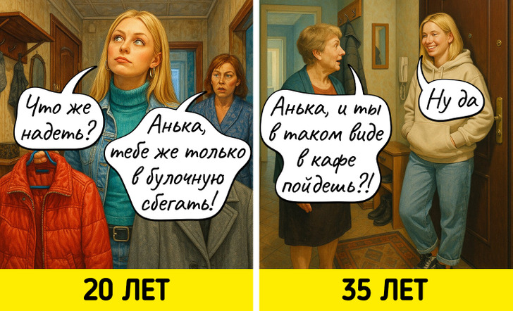 С годами многие вещи, которые казались нам когда-то важными, теряют свое значение. Мы начинаем спокойнее относиться к критике, больше ценим комфорт, а не внешнюю привлекательность, и, главное, с большей заботой относимся к себе. Мы задумались о том, как же наши взгляды на жизнь поменялись, и попросили нейросеть нарисовать об этом комиксы.