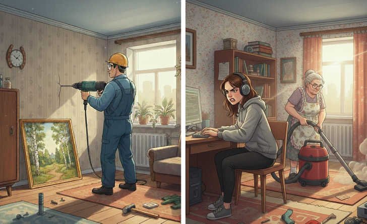 11. Важный созвон с шефом случается не чаще раза в год, но именно в этот день и час сосед решает повесить картину, а домашним позарез надо пропылесосить