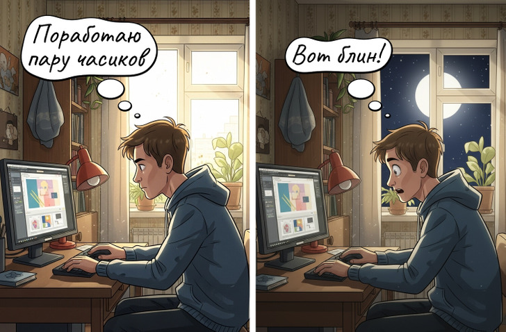 16. Редко какой удаленщик замечает течение времени. Планируешь сделать задачу за час-другой, а очнешься — за окном уже темень