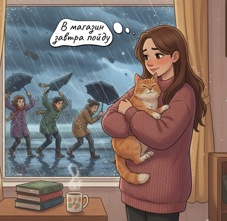 6. Нет ничего лучше, чем смотреть на улицу сквозь окно, как люди борются с ураганным ветром по пути на работу
