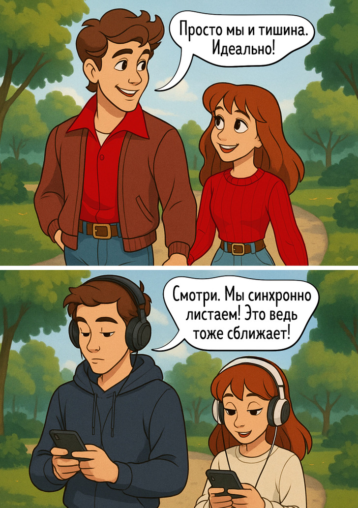 И тишина между нами была полной, а теперь — каждый в своем шуме: в наушниках, в ленте, в бесконечном скроллинге