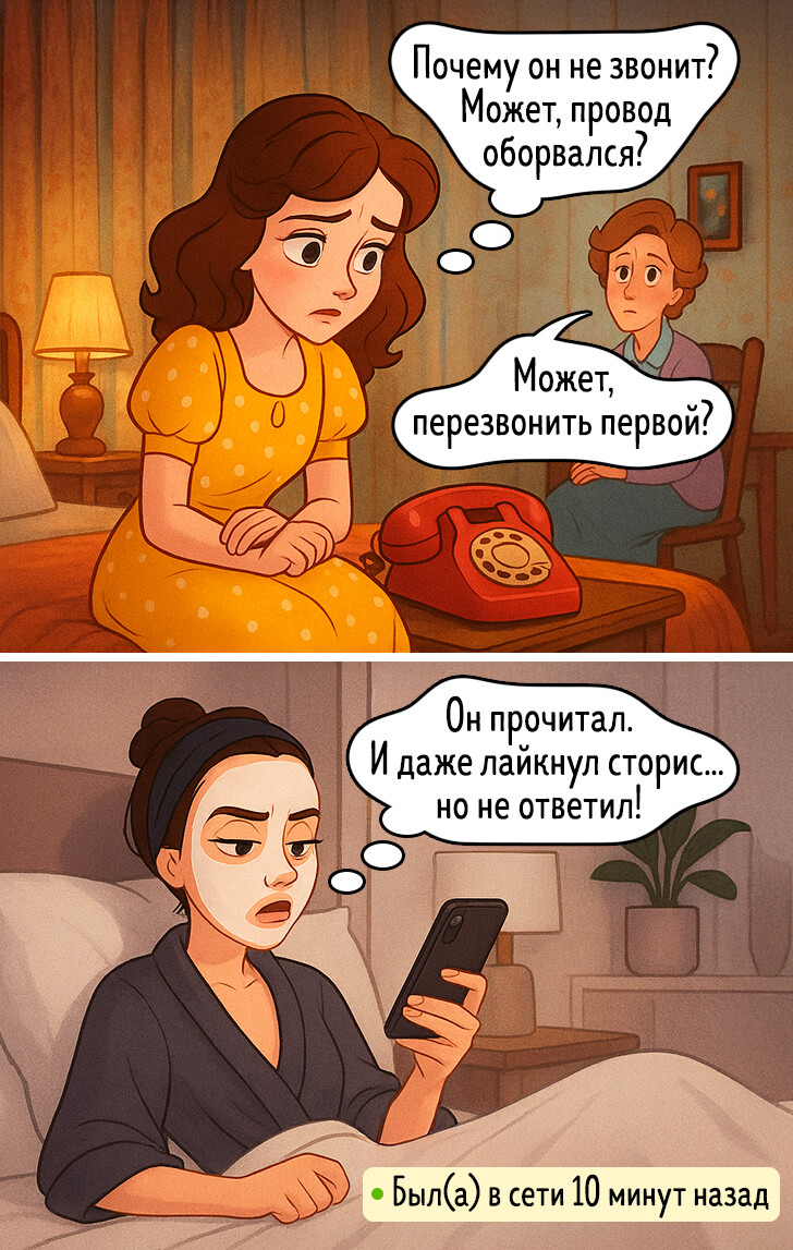 Раньше, чтобы поговорить с любимым, нужно было часами сидеть у телефона и ждать звонка. Теперь все на экране: увидел, прочитал, но не ответил... Ну, или ответил.