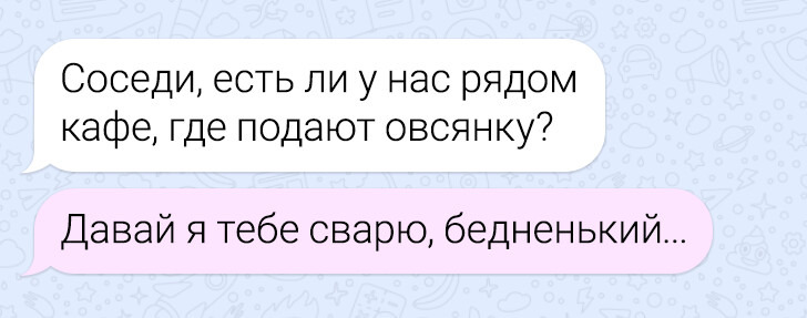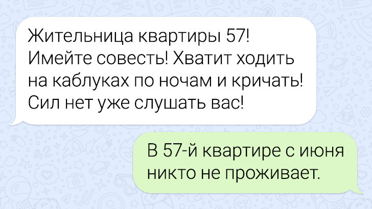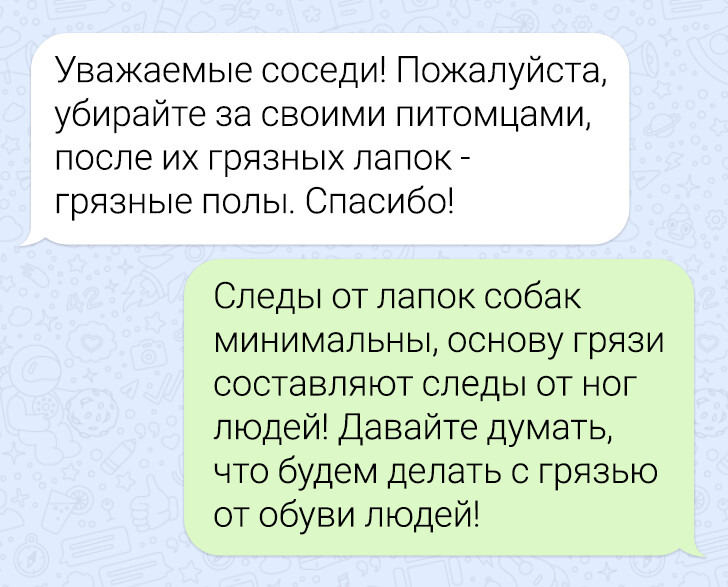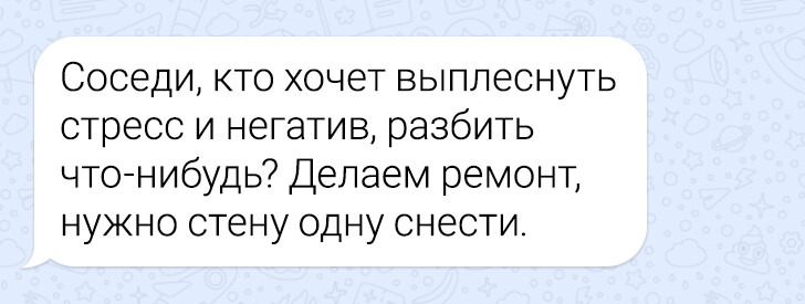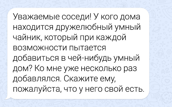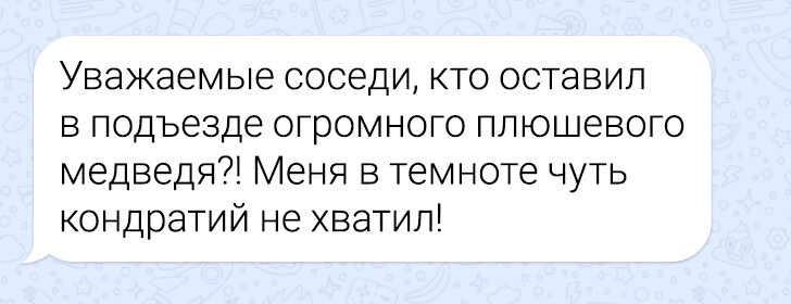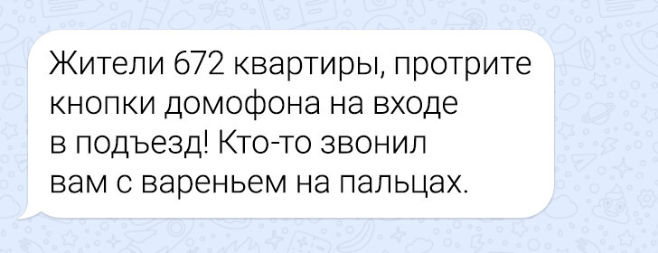 Порой соседи — словно инопланетяне: их слова и поведение не поддаются никакой логике. И ярче всего это видно по их фразочкам в общедомовых чатах — странным, смешным или загадочным. В этой статье мы собрали самые яркие из них.