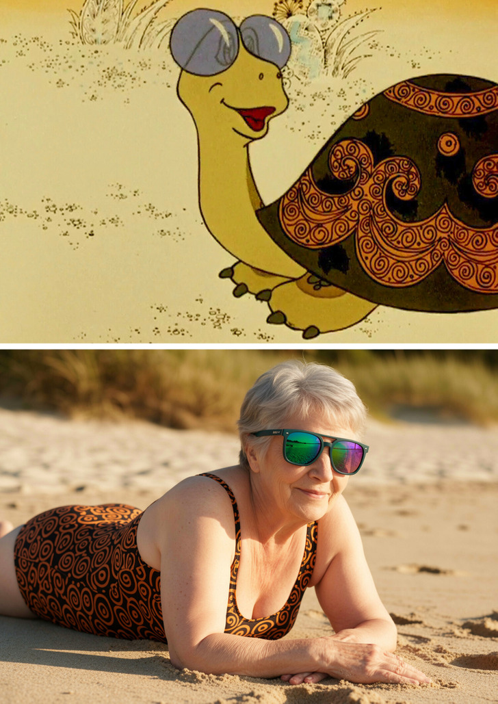 Черепаха из мультфильма «Как Львенок и Черепаха пели песню». Добродушная и мудрая пенсионерка, которая обожает солнце, море и пляж. Иногда поет в караоке