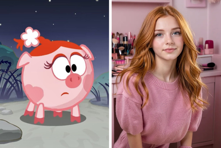 Нюша из мультфильма «Смешарики». Юная романтичная особа, в меру любопытна. Влюблена в музыканта, который выступает под псевдонимом Черный ловелас