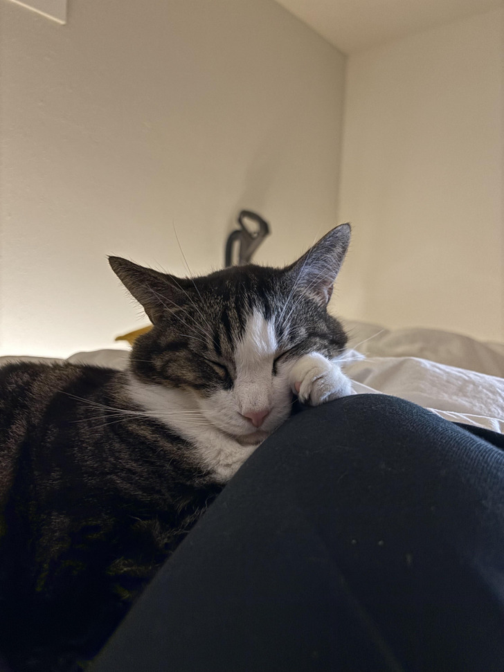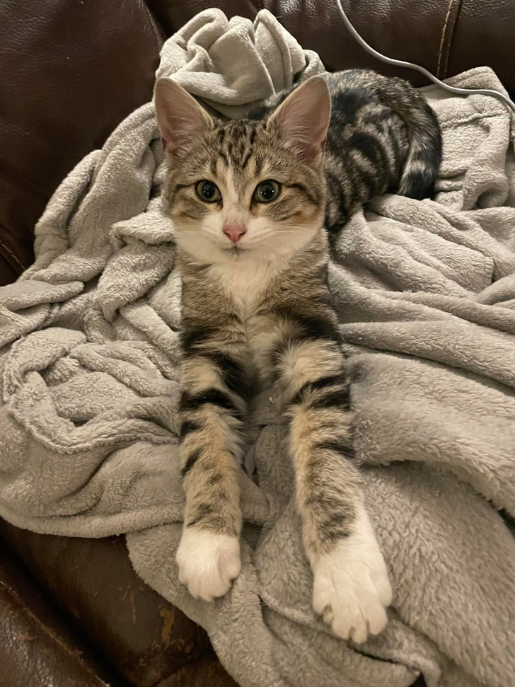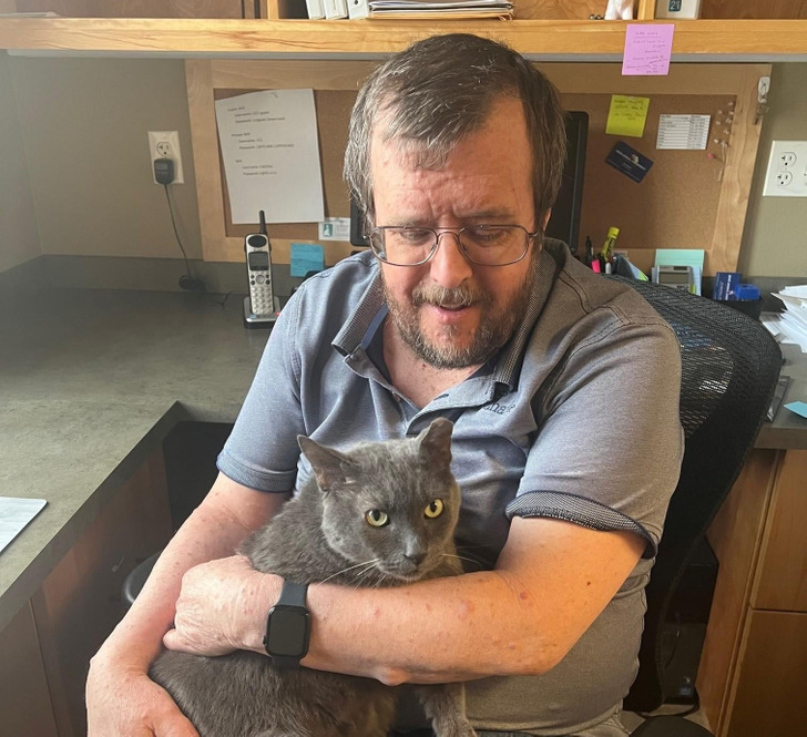 Ветеринар познакомила меня с семилетним котом, которого они пытались пристроить. Он был серым и не совсем здоровым, так как его подобрали с улицы. Врачи сказали мне, что он боится мужчин, но он почти сразу успокоился, как только я зашел в кабинет. Он запрыгнул на стол и позволил мне себя погладить и даже подержать. Я позвонил на следующий день и сказал, что приючу его. С января 2023 года он мой друг.